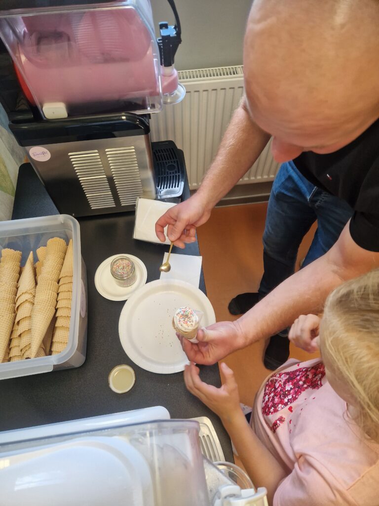 Panime tööle kaks jäätisemasinat, nii et kokku valmis lausa 12 liitrit jäätist. Ühes masinas oli vanilješokolaadi tükkidega, teises maasikajäätis. Lapsed seisid järjekorras ja Rando serveeris kõigile nii mitu jäätist, kui keegi soovis – rõõmu ja naeru oli palju!