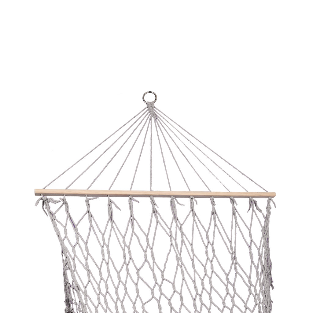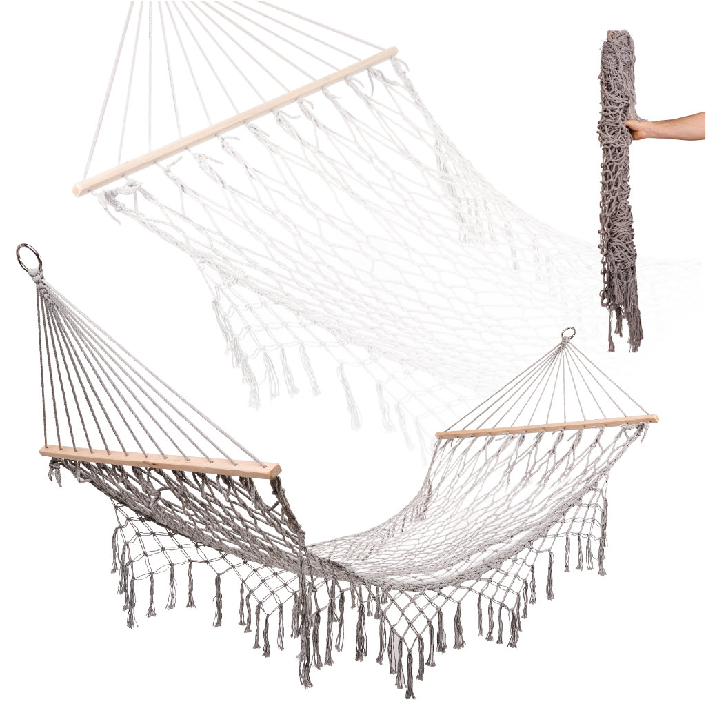 Hängematt on valmistatud tihedalt kootud puuvillast köitest (65%), mis annab sellelesuure vastupidavuse. See suudab hõlpsasti kanda kuni 250 kilogrammi raskust. Helebeež värvus ja tupsud servadel annavad sellele elegantse välimuse, mis sobib ideaalselt igasse aiakeskkonda. Hängematt on riputatud 100 sentimeetri laiuse puitkarkassi külge, mis tagab piisava stabiilsuse ja mugavuse. Kokkurullituna võtab see väga vähe ruumi, mistõttu on seda lihtne hoiustada.
