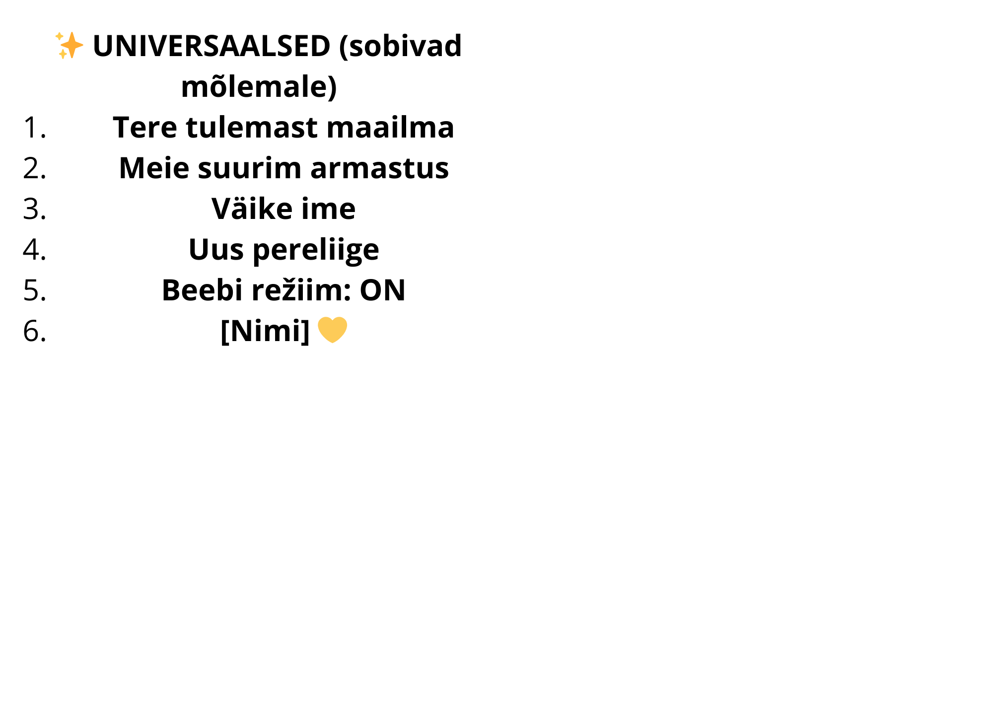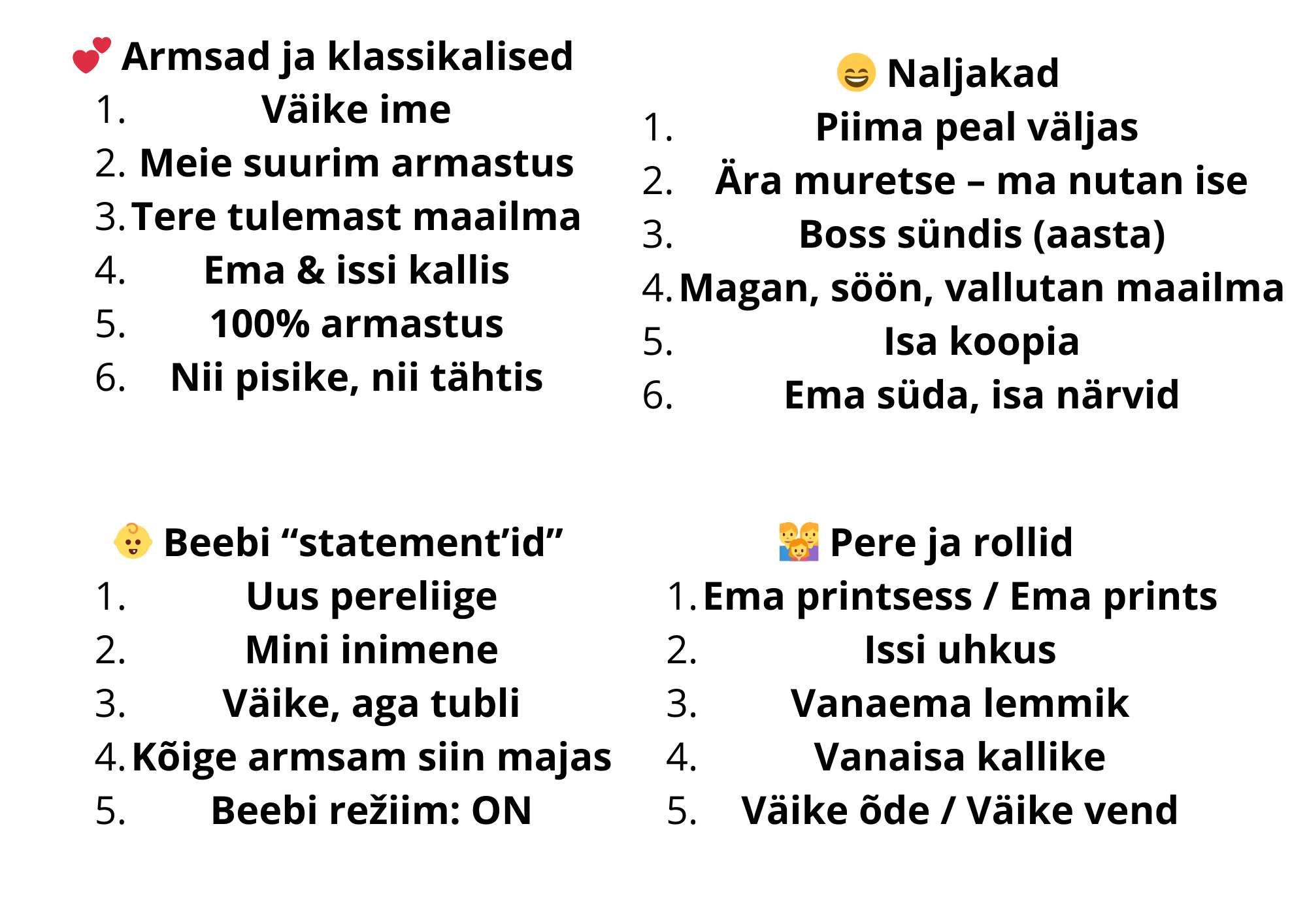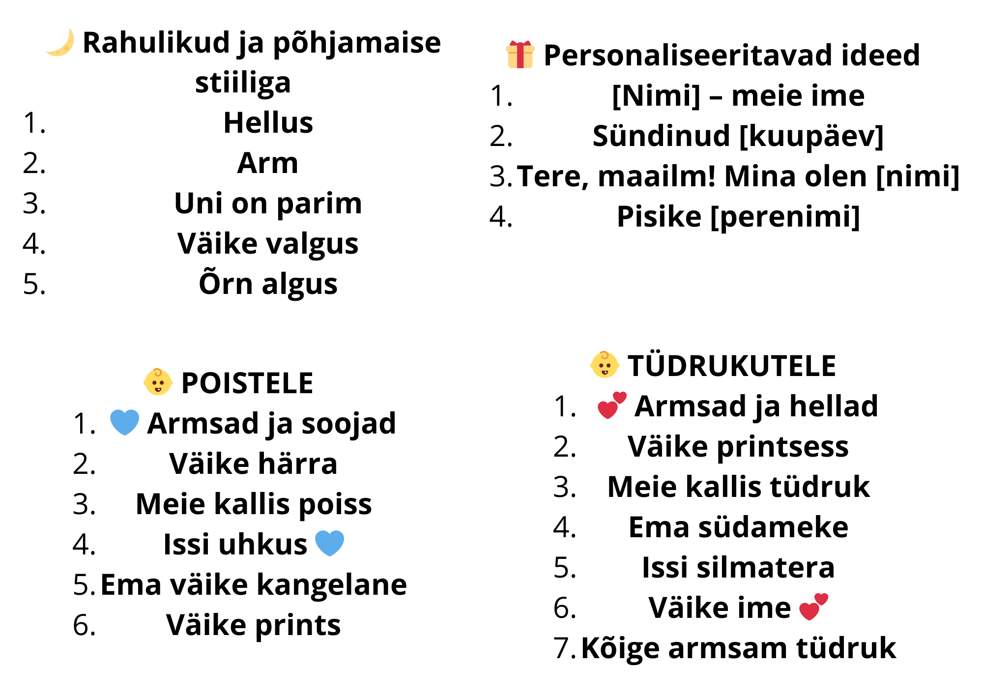 Valikus on nii armsad, naljakad kui ka rahulikud ja põhjamaise stiiliga tekstid, mis sobivad võrdselt hästi nii poisile kui ka tüdrukule. Soovi korral saab body personaliseerida lapse nime, sünniaasta või muu lühikese tekstiga, et muuta see eriti eriliseks mälestusesemeks.