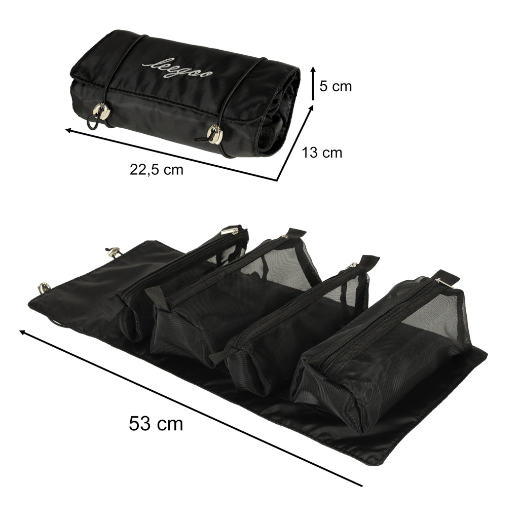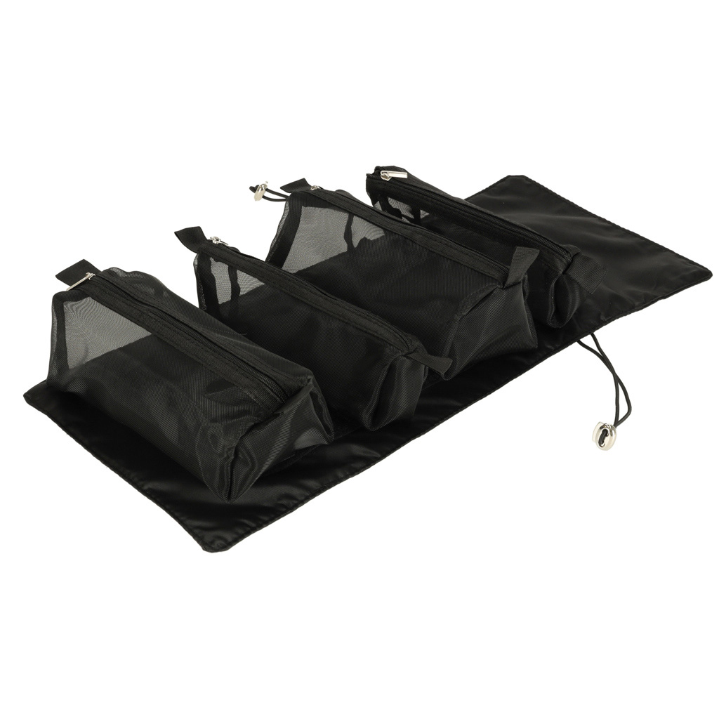 Must reisikosmeetikakott – saab kokku rullida, et võtta pagasis vähem ruumi. Sellel on neli lahtrit, mida saab välja võtta. Lahtrite seinad on valmistatud võrgust, mis hõlbustab toodete leidmist ja tagab ka niiskete pakendite hea ventilatsiooni.