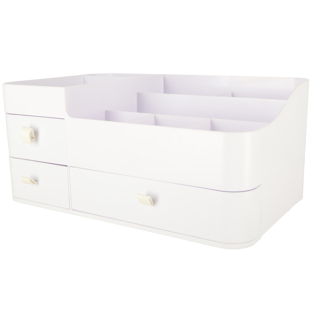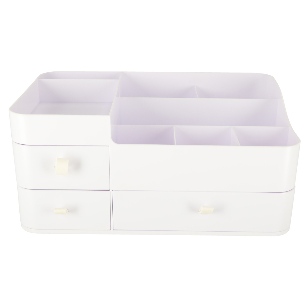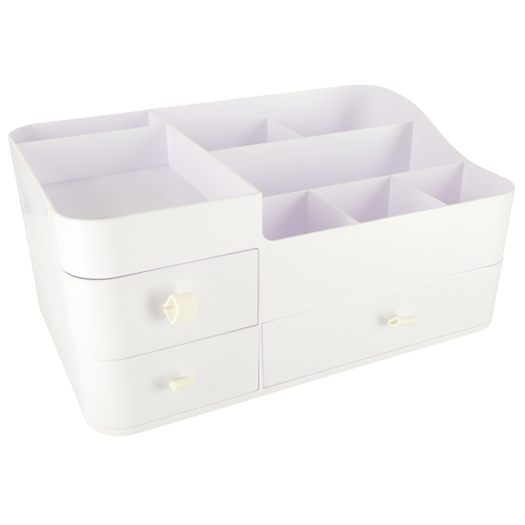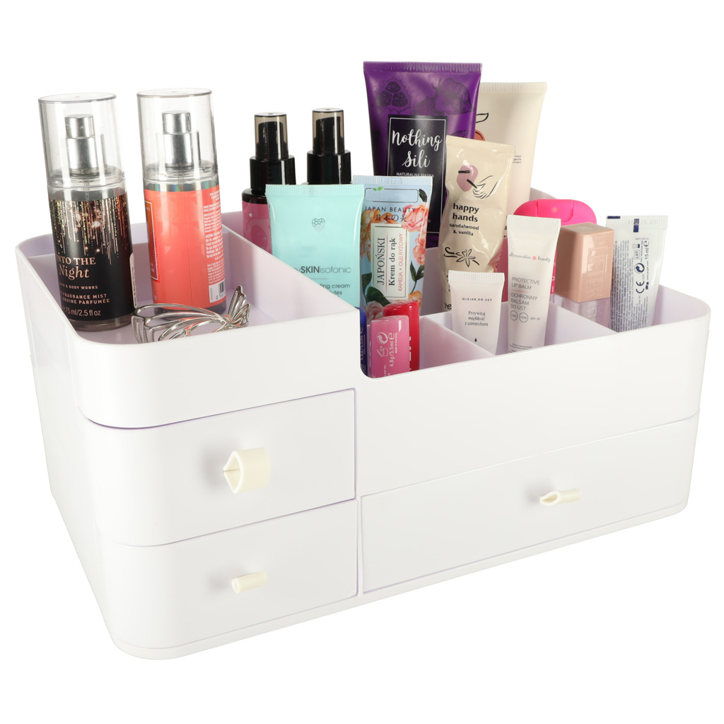Elegantse valge värviga kaasaegneminimalistlik disain muudab organiseerija sobilikuks mis tahes interjööriga – olgu see siis magamistoa garderoobilaual või vannitoa riiulil.