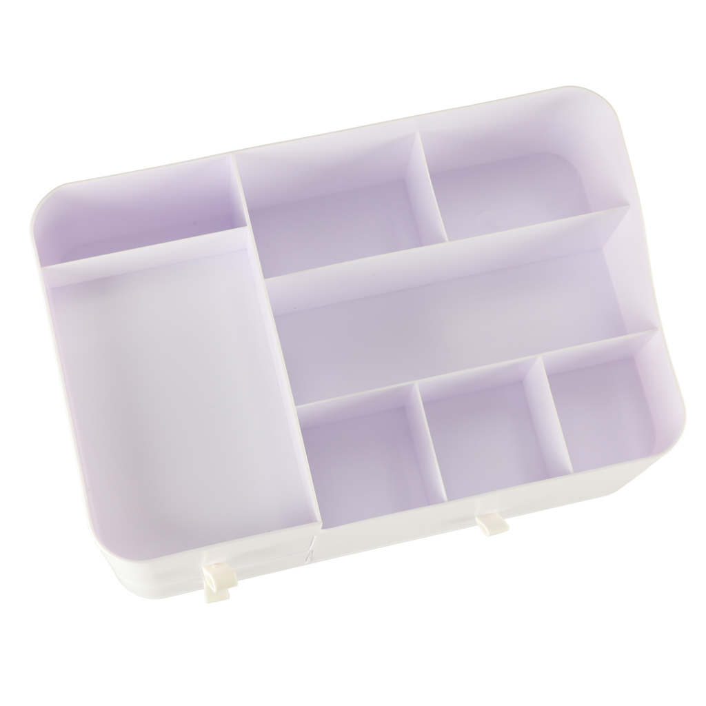 Organisaatori ülaosas on seitse erineva suurusega lahtrit, mis on ideaalsed igapäevaste kosmeetikatoodete, näiteks pintslite, huulepulkade, ripsmetuši või parfüümipudelite eraldamiseks. See tagab, et igal tootel on oma koht, mis teeb selle kiire leidmise lihtsaks ja säästab aega hommikuse rutiini ajal.