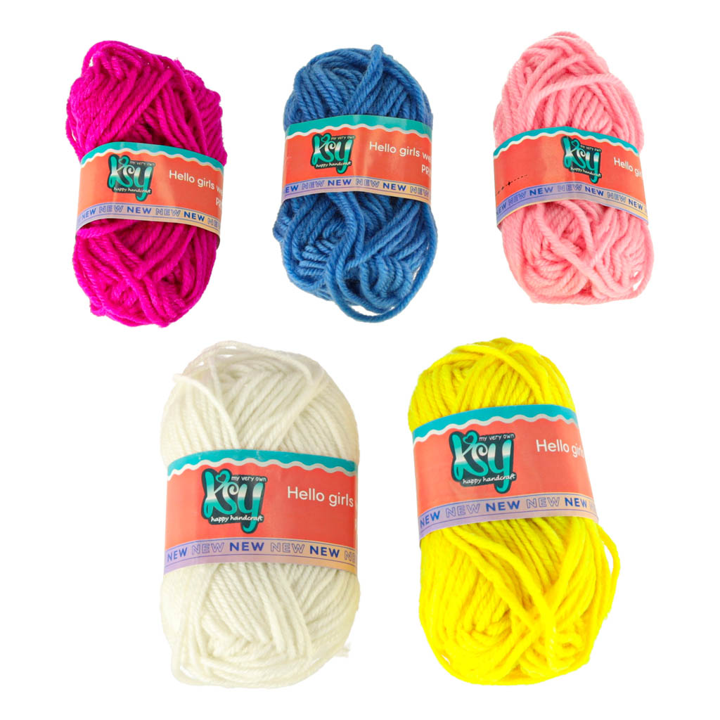 – 5x lõngad erinevates värvides : (kollane , sinine , valge, lilla, roosa).