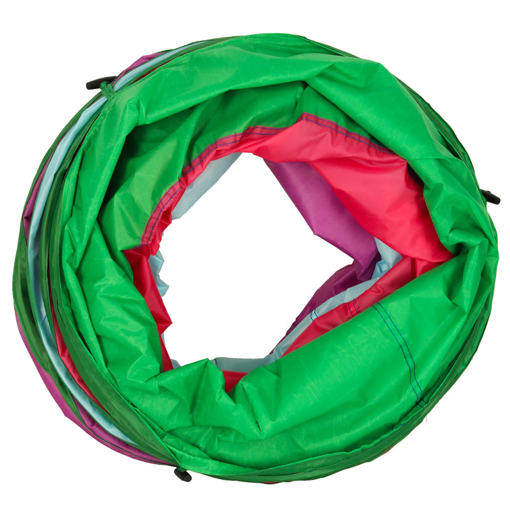 Tunnelit saab kasutada mitmel viisil. Saate roomiku külge kinnitada pea ja saba või jätta läbipääsud avatuks. Nutikas iseklappiv disain ja mugav kandekott võimaldavad tunnelit lahti voltida nii siseruumides kui ka õues.