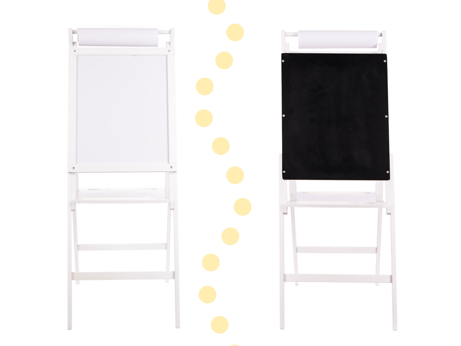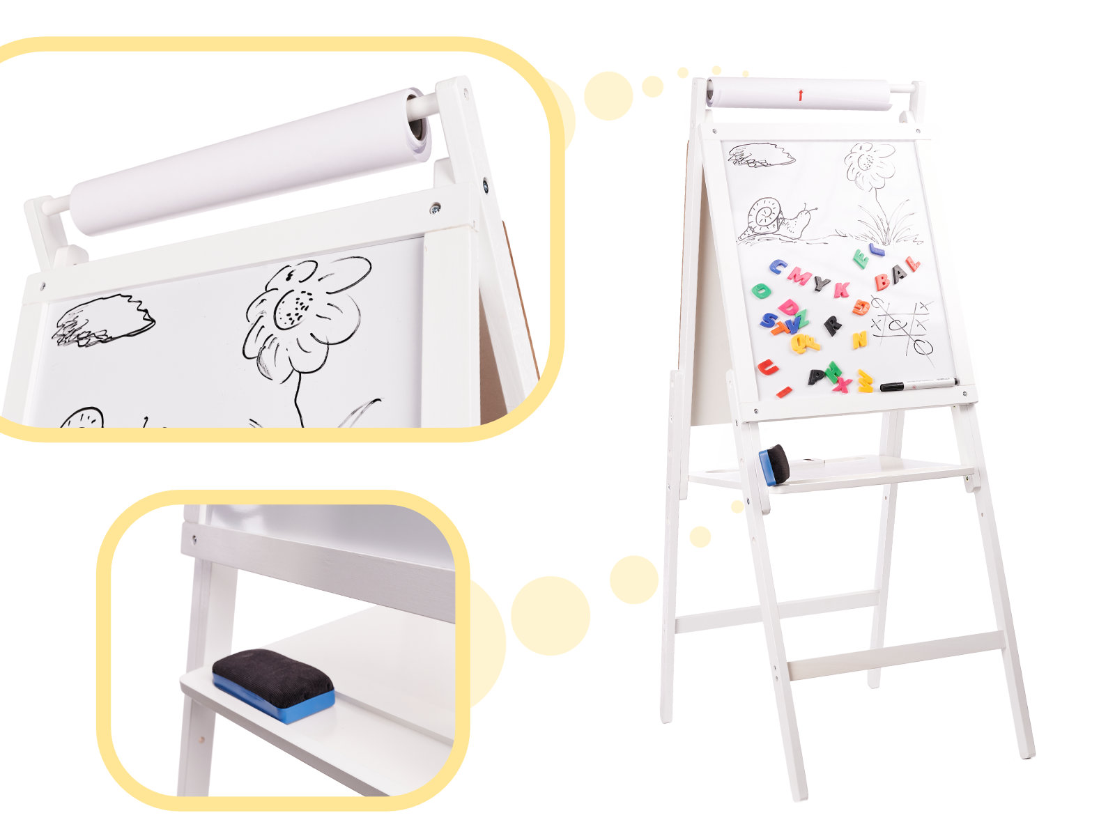 Tahvli valge külg on mõeldud markeritega kirjutamiseks või joonistamiseks ning sellele saab kinnitada ka magnetid. Teisele küljele keerates ilmub tahvel.