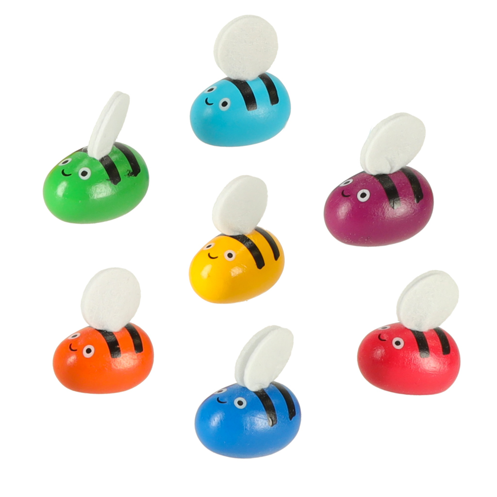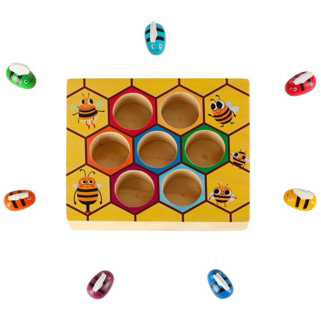 Sisaldab 7 mesilast – igaühel on erinev värv ja tahvel/põhi on valmistatud täispuidust. Alusel on lõbus meekärgede motiiviga pilt.