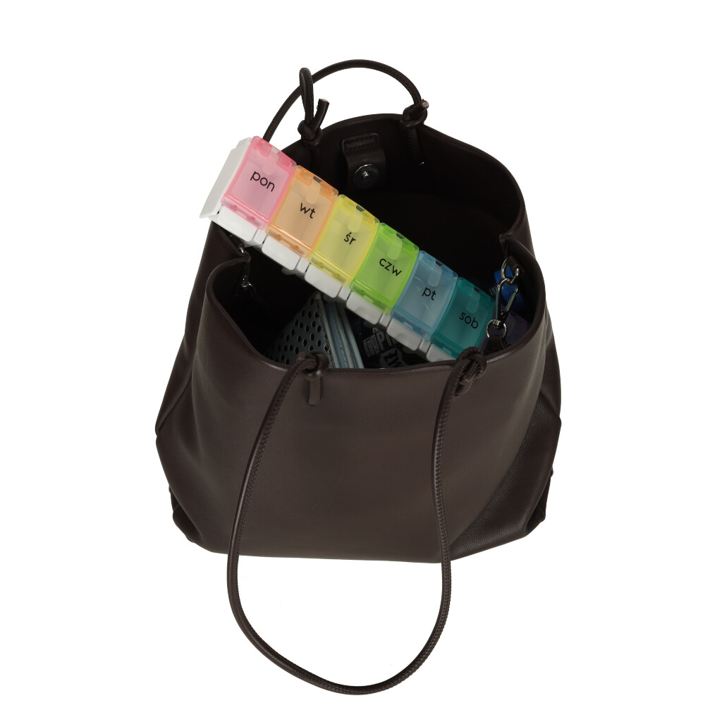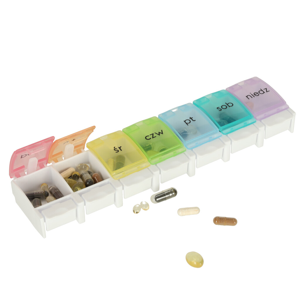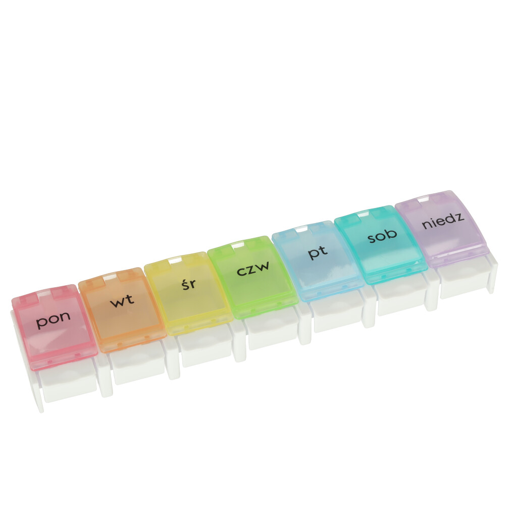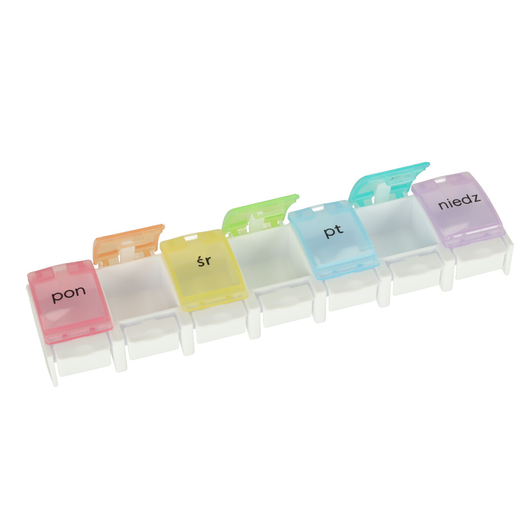 Iga lahter on poola keeles märgistatud ja igale nädalapäevale on määratud erinev värv. Pillide paigutamine nädala konteineritesse lihtsustab nende regulaarset võtmist!