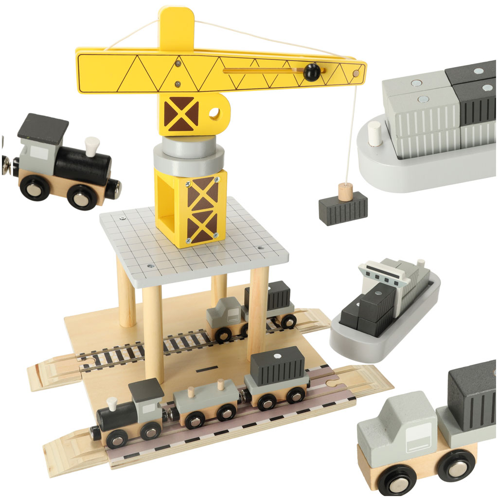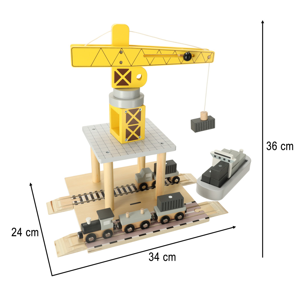Puidust meresadam koos kraanaga on suurepärane mänguasi väikestele transpordi- ja ehitushuvilistele. Komplekt koosneb kollasest sadamakraanast, mida saab keerata ja tõsta konteinereid laevalt transpordivahenditele – veoautole ja kahe vaguniga rongile. Erinevad komponendid võimaldavad lapsel läbi mängida stseene nagu päris sadamas, arendades nende loovust, käelisi oskusi ja motoorset koordinatsiooni.