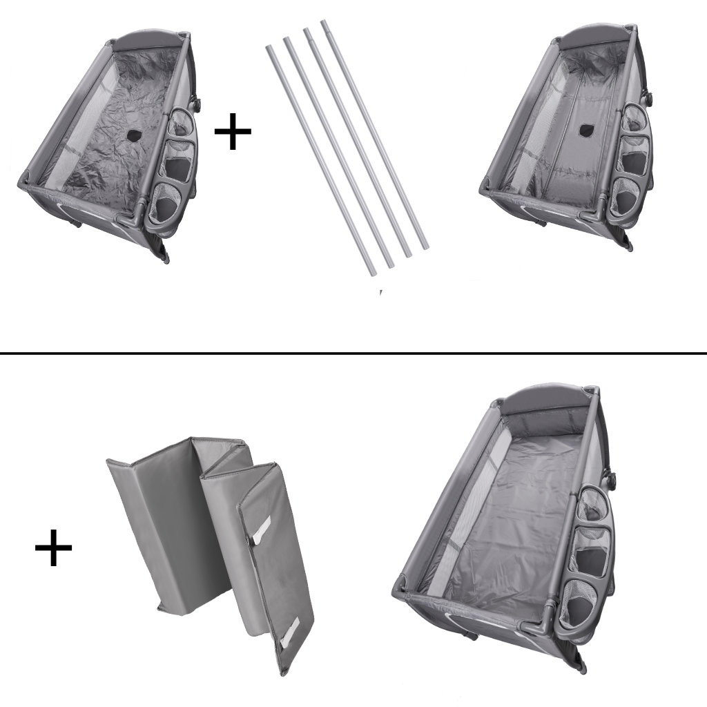Muuhulgas on võrevoodi koos kinnitatava teise voodikoha ja taskutega mähkimislauaga. Sellised vahendid suurendavad selle funktsionaalsust, muutes selle sobivaks nii lühikesteks kui ka pikemateks reisideks. X-kujuline disain, libisemiskindlad jalad ja lukustatavad rattad muudavad voodi praktiliseks ja stabiilseks. Nutikalt paigutatud taskute ja lahtrite abil on lihtne pagasit lahti pakkida ja korraldada. Voodi koos muutmislauaga pakub mugavust väikelapse vahetamisel ja ümberpanekul.