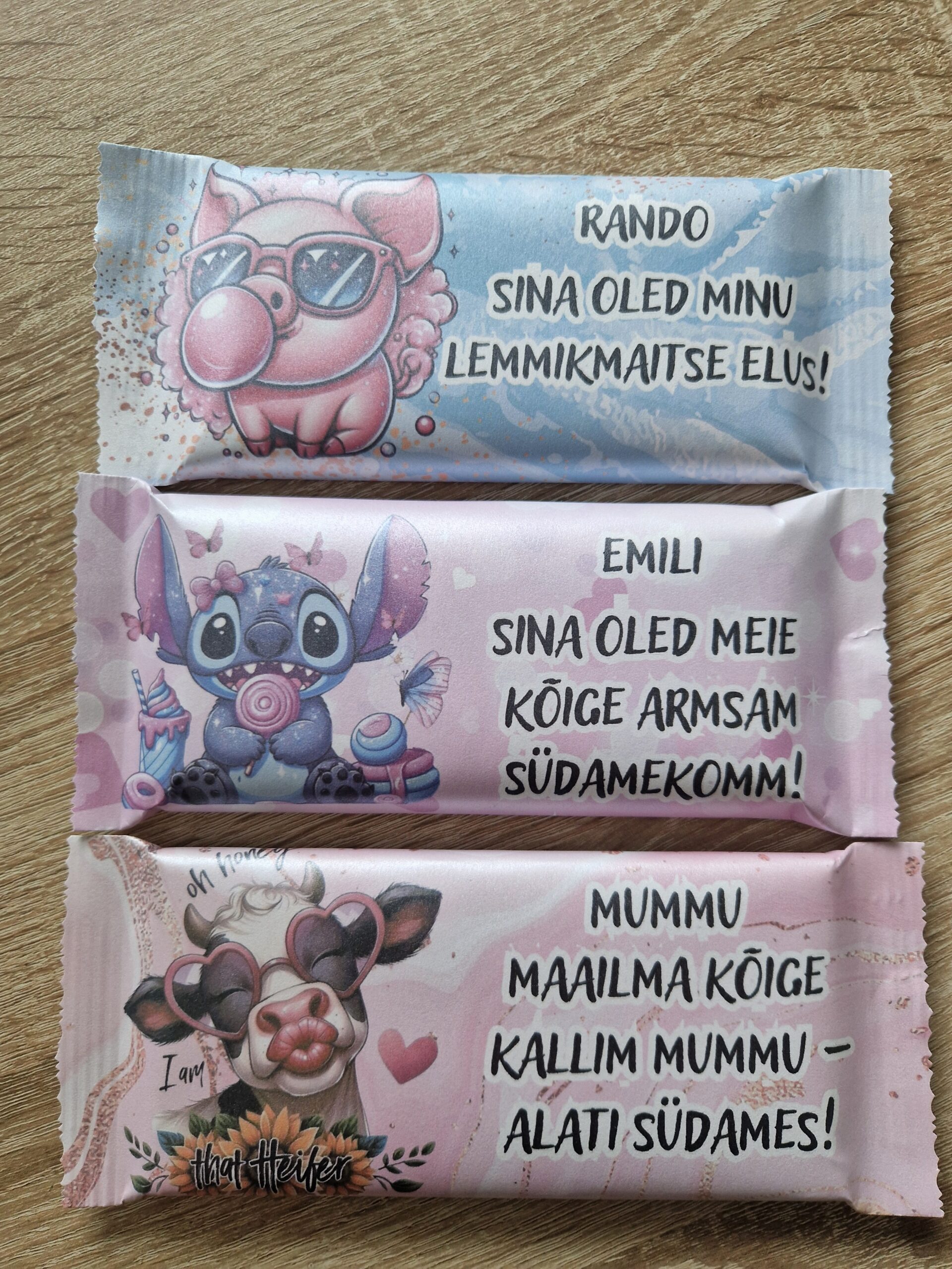 Kasutame kvaliteetset piimašokolaadi, mille originaalpakend jääb alati šokolaadi kaitseks alla. Meie lisame ümber sinu soovidele vastava disainitud paberi.