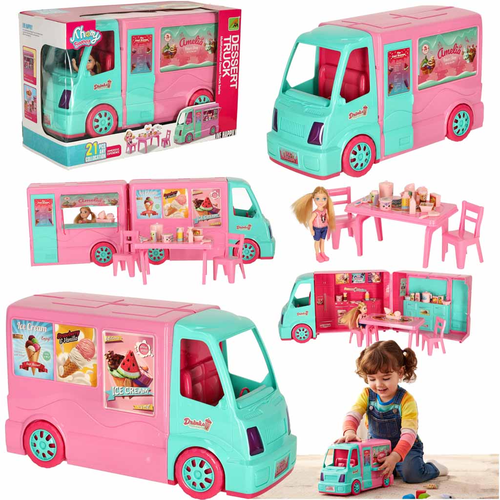Komplektis on ühendatud kaks funktsiooni – põnev kulinaarne seiklus, kus nukk serveerib toiduautost maitsvat jäätist, ja lõõgastav matkaauto reis, mis muutub hubaseks puhkekohaks. Laps saab võtta endale loomingulise müüja või mobiilse jäätisekohviku juhi rolli ning kui päev on lõppenud, avada sõiduk ja muuta see mugavaks matkaauto, mis sobib ideaalselt puhkehetkedeks.