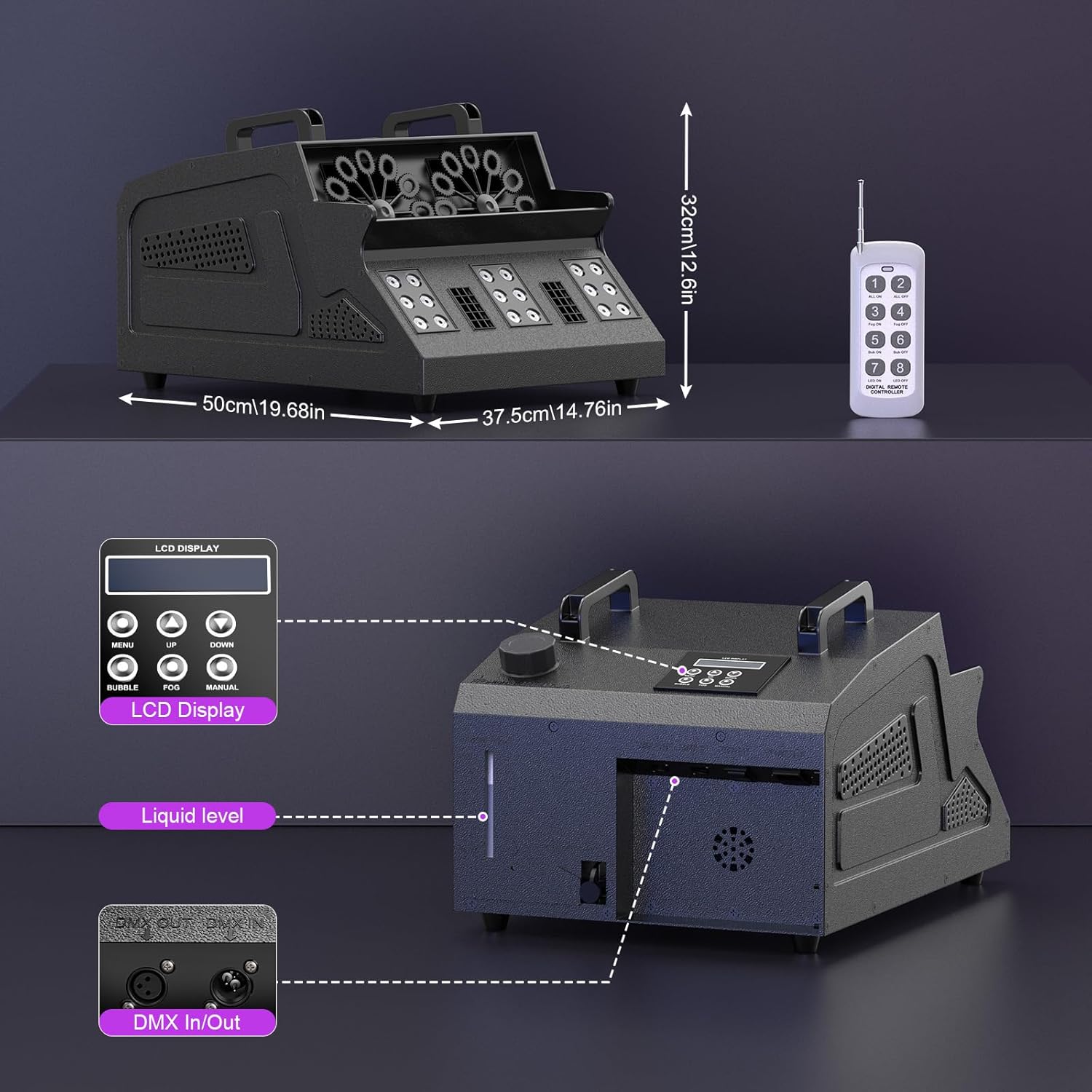 💨🎉 Seade ühendab kaks silmapaistvat efekti – tihe udu ja värvilised seebimullid, mille koosmõju loob tõeliselt ainulaadse atmosfääri. Ideaalne nii pidudele, etendustele, üritustele kui ka hooajalistele kaunistustele (nt Halloween või jõulud).