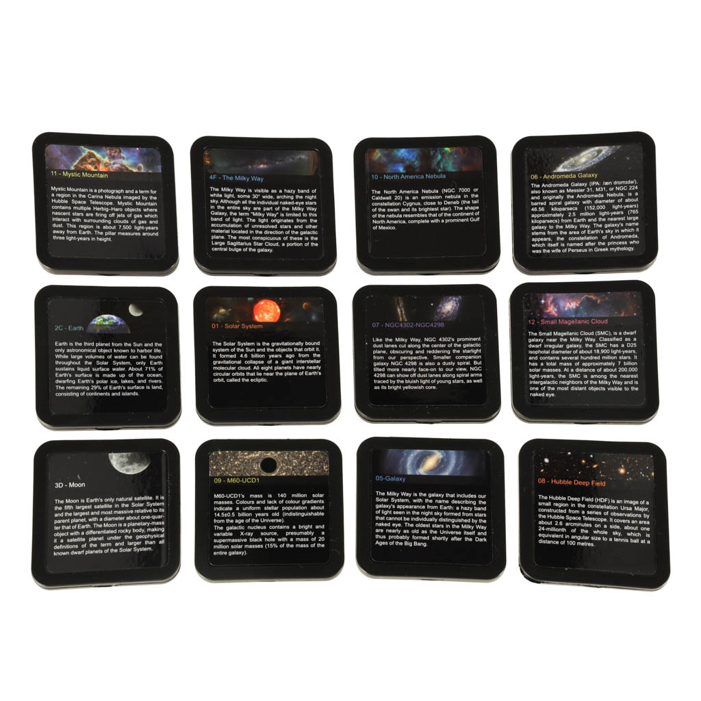 Komplektis on 12 erineva pildiga ketast, sh: Maa, Päikesesüsteem, Linnutee Kuu. Igal kettal on kirjas ja lühikirjeldus (inglise keeles), mis võimaldab teil õppida kosmilisi objekte tundma.